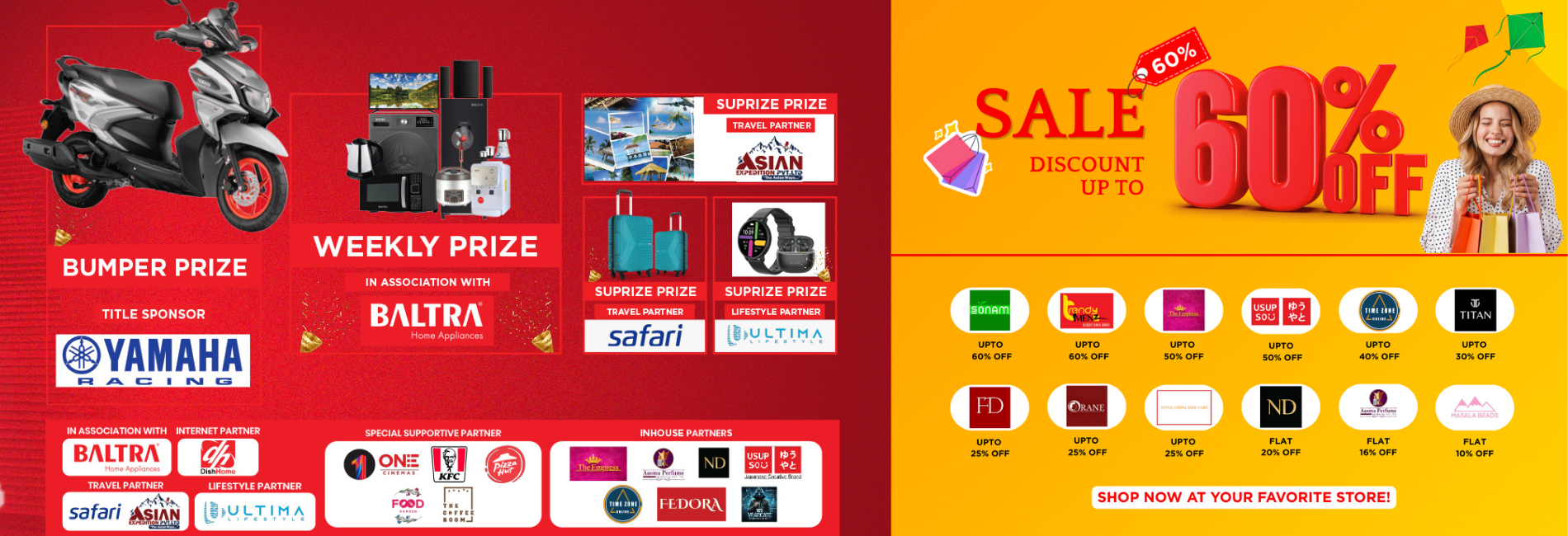 From Ashoj 3 to Kartik 14, shop Rs.1000+ to join our Lucky Draw and win exciting prizes — while enjoying up to 60% OFF at your favorite stores!